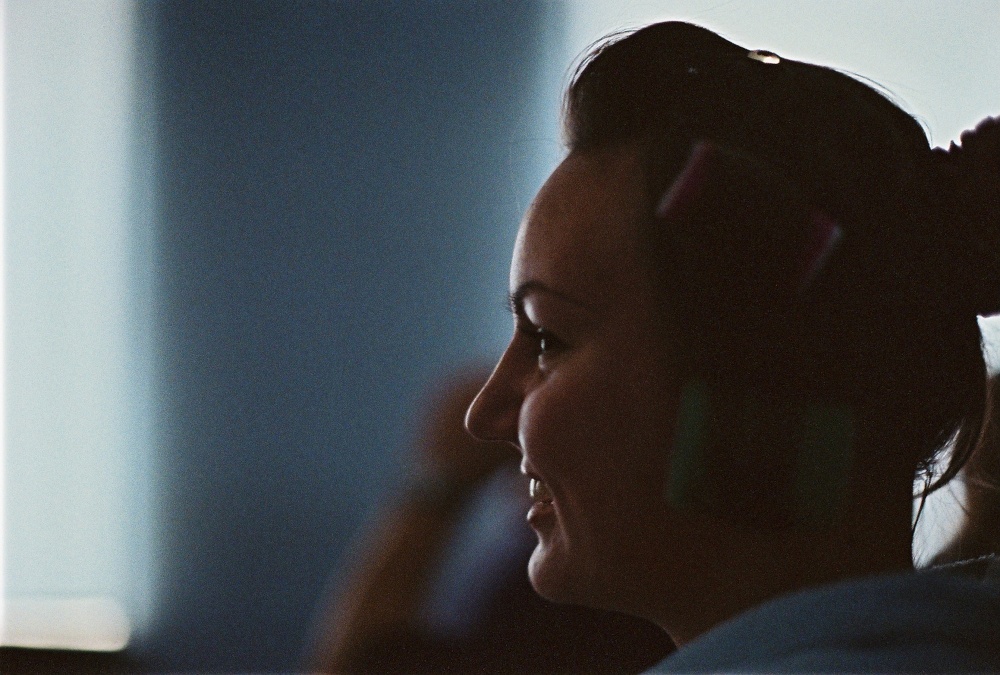 Будучи приглашённым на официальное мероприятие, прихватил камеру. Ну, и сфоткал соседку. Темнота была, впрочем, на снимке видно. Но просроченная на три года Fuji 1600 и Nikkor 55/1,2 вытянули. Жаль, рука на заднем плане помешала…